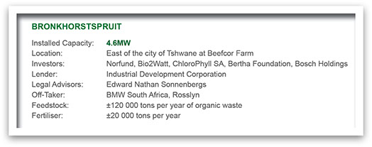 Bio2Watt built the first commercially viable biogas project in South Africa, the Bronkhorstspruit Biogas Plant, which it owns and operates.
