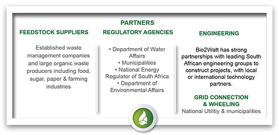 Strong partnerships have been established with leading local and global agricultural, industrial & technology players. Bio2Watt’s partners are not only offered a sustainable solution to dispose of their waste, large power-users also have an opportunity to diversify their energy supply and reduce their carbon footprint by purchasing a percentage of their power from a green energy source. This option is becoming increasingly competitive when compared to new generation fossil fuel derived electricity.
